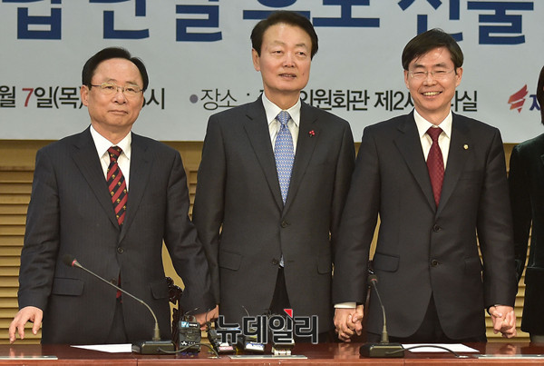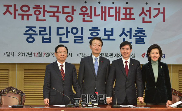 자유한국당 한선교 의원이 7일 오후 국회 의원회관에서 원내대표 선거 중립 단일 후보로 선출된 후 낙선한 이주영, 조경태 의원과 사진을 찍고 있다.