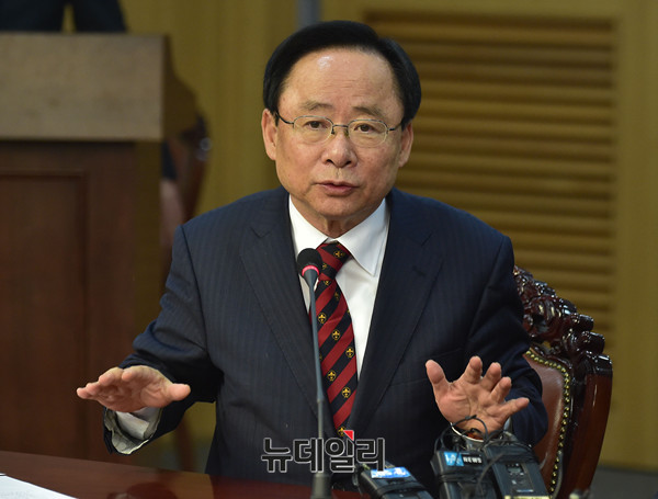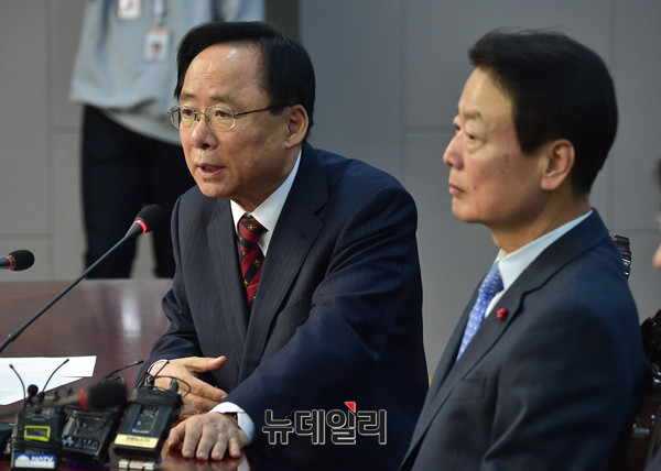 자유한국당 이주영 의원이 7일 오후 국회 의원회관에서 열린 원내대표 선거 중립 단일 후보로 선출 발표에서 당선자인 한선교 의원 지원 방안을 발언하고 있다.