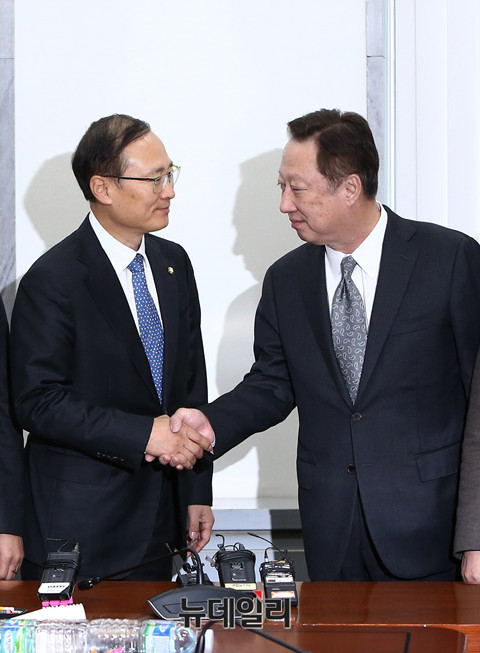 박용만 대한상공회의소 회장이 7일 오전 국회를 찾아 홍영표 환경노동위원장을 만나고 있다. 이날 박 회장은 여야가 논의 중인 노동현안에 대한 경제계 입장을 전달한 것으로 알려졌다.