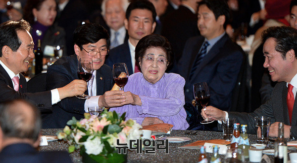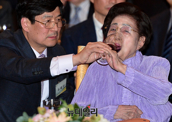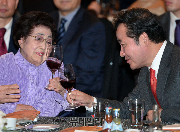 김대중 전 대통령 부인 이희호 여사와 이낙연 국무총리가 7일 오후 서울 63시티 컨벤션센터에서 열린 '김대중 전 대통령 노벨평화상 수상 17주년 기념 행사'에 참석해 건배를 하고 있다.