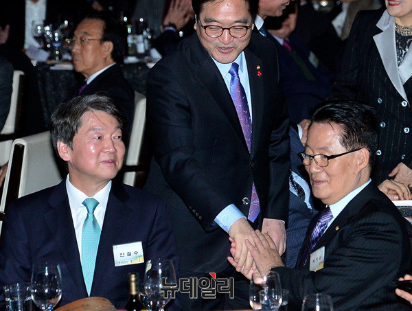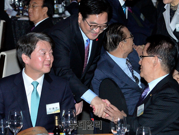 박지원 국민의당 전 비상대책위원장과 우원식 더불어민주당 원내대표가 7일 오후 서울 63시티 컨벤션센터에서 열린 '김대중 전 대통령 노벨평화상 수상 17주년 기념 행사'에 참석해 악수를 나누고 있다.