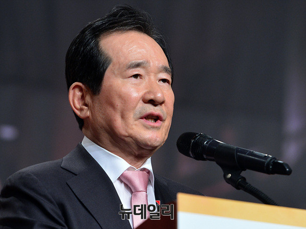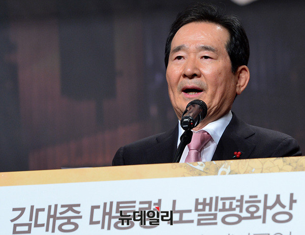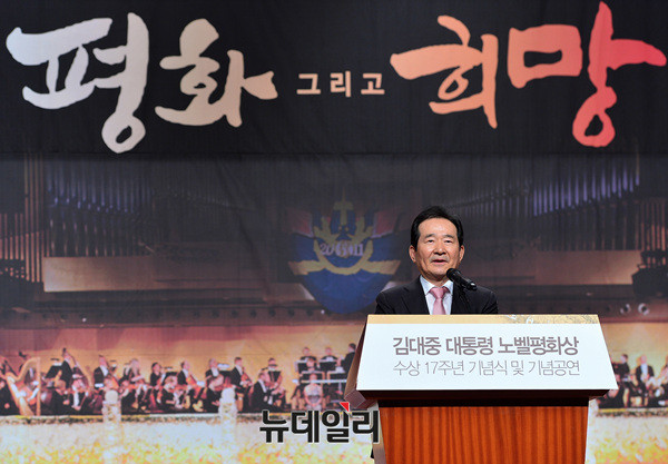 정세균 국회의장이 7일 오후 서울 63시티 컨벤션센터에서 열린 '김대중 전 대통령 노벨평화상 수상 17주년 기념 행사'에 참석해 개회사를 하고 있다. 이날 정 의장은 약 40분 늦게 도착했다.