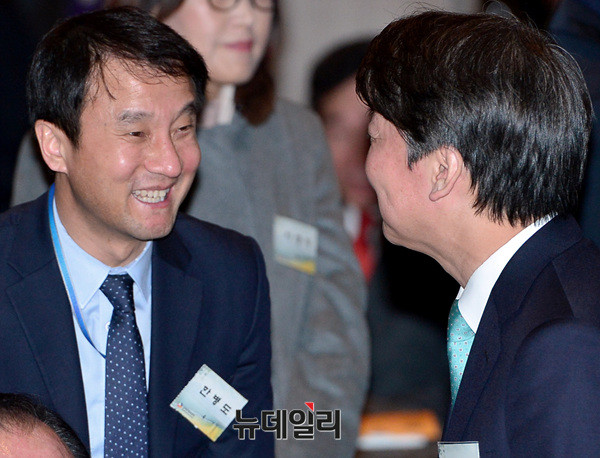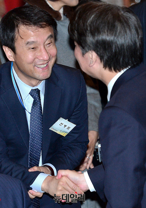 한병도 청와대 정무수석과 안철수 국민의당 대표가 7일 오후 서울 63시티 컨벤션센터에서 열린 '김대중 전 대통령 노벨평화상 수상 17주년 기념 행사'에 참석해 악수를 나누고 있다.