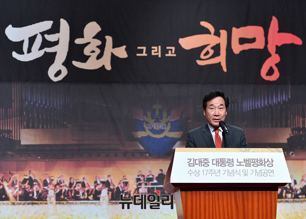 이낙연 국무총리가 7일 오후 서울 63시티 컨벤션센터에서 열린 '김대중 전 대통령 노벨평화상 수상 17주년 기념 행사'에 참석해 축사를 하고 있다.