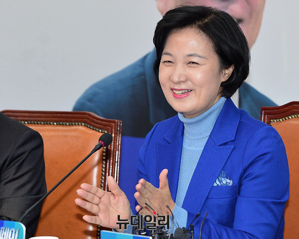 추미애 더불어민주당 대표, 우원식 원내대표, 박범계 최고위원이 8일 오전 국회에서 열린 최고위원회의에 참석해 지난 7일 MBC 사장으로 선임된 최승호 뉴스타파 PD를 축하하며 박수를 치고 있다.