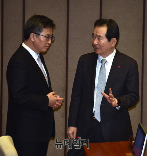 정세균 국회의장과 김동연 경제부총리 겸 기획재정부 장관이 8일 오후 국회 본회의에서 열린 본회의에서 대화를 나누고 있다.