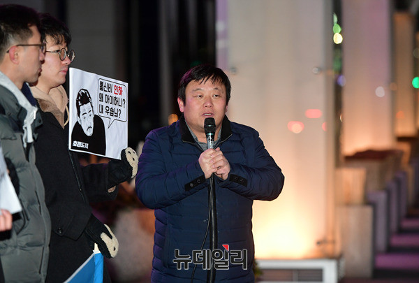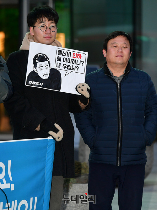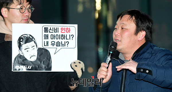 안진걸 참여연대 사무처장이 8일 오후 서울 중구 SKT타워 입구에서 성공회대 학생들과 △기본료폐지 △보편요금제 도입 △데이터요금제 인하 등을 요구하는 기자회견을 하고 있다.