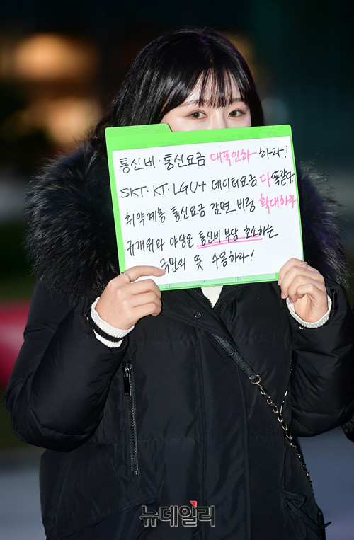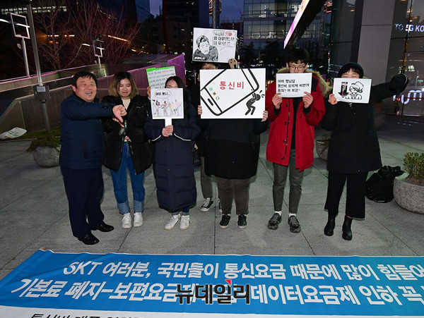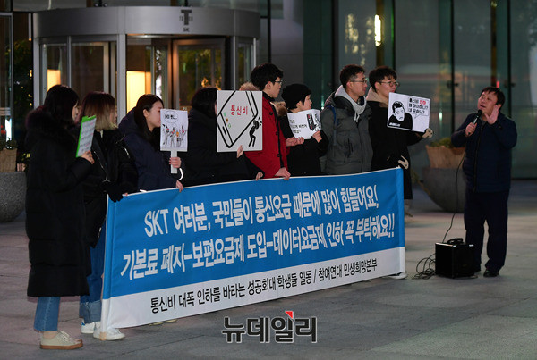 안진걸 참여연대 사무처장과 통신비 인하를 바라는 성공회대 학생들이 8일 오후 서울 중구 SKT타워 입구에서 기자회견을 열고 △기본료폐지 △보편요금제 도입 △데이터요금제 인하 등을 요구하고 있다. 안 사무처장은 성공회대학교에서 'NGO(비정부단체)' 관련 강의를 맡고 있다.
