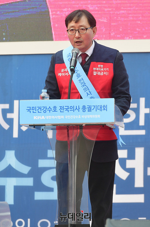 추무진 대한의사협회장이 10일 오후 서울 대한문 앞에서 열린 국민건강수호 전국의사총궐기대회에서 격려사를 하고 있다. 전국에서 대한문에 모인 집회 참석자들은 '문재인 케어'가 전형적인 포퓰리즘이라고 주장하며 집회 직후 청와대 인근 효자치안센터까지 가두행진을 이어갈 예정이다.