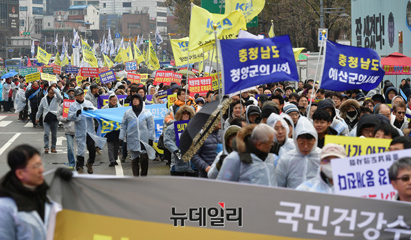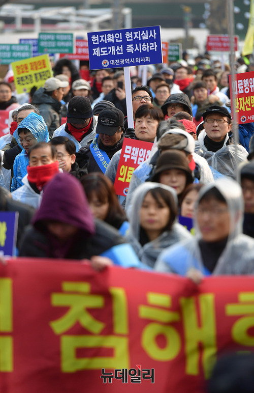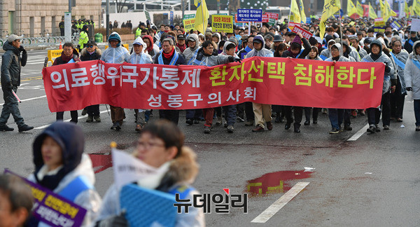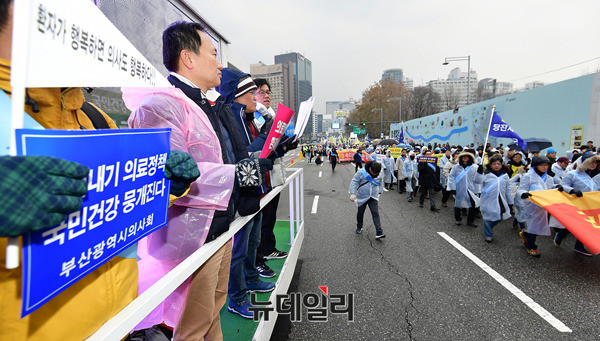 국민건강수호 전국의사총궐기대회 참석들이 10일 오후 서울 대한문 앞에서 열린 집회 직후 '문재인 케어'를 반대하는 현수막과 손피켓을 들고 청와대 인근 효자치안센터까지 가두행진을 이어가고 있다. 이들은 이날 총궐기대회를 통해 △급여의 정상화 △비급여의 급여화 및 예비급여 원점 재검토 △한의사의 의과 의료기기 사용불가 △소신진료를 위한 심사평가체계 및 건보공단 계혁 등을 요구했다.