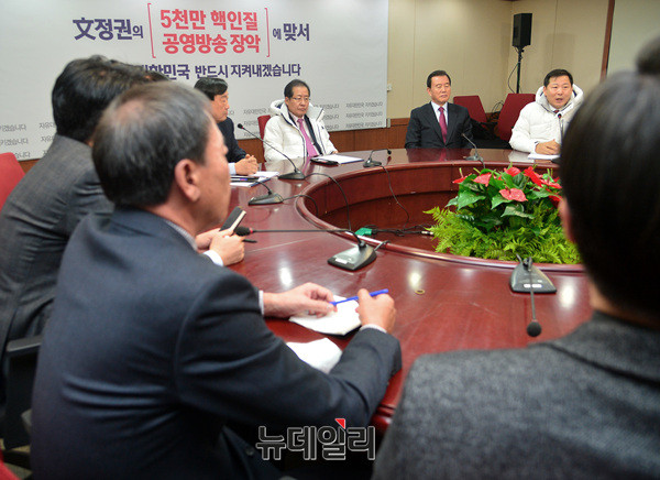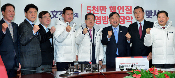 홍준표 자유한국당 대표와 이희범 평창동계올림픽 조직위원장이 11일 오전 서울 여의도 중앙당사에서 열린 '2018 평창 동계올림픽-패럴림픽 대회 입장권 구매 협약식'에 참석해 티켓을 들어 보이고 있다.