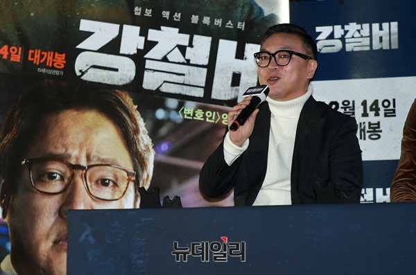 배우 김의성이 11일 오후 서울 용산구 CGV아이파크몰에서 열린 영화 '강철비(감독 양우석)' 언론시사회에서 인사말을 하고 있다. '강철비'는 대한민국에서 일어날 수 있는 북한 도발에 대한 가정을 근거로 만든 영화로 오는 14일 개봉한다.