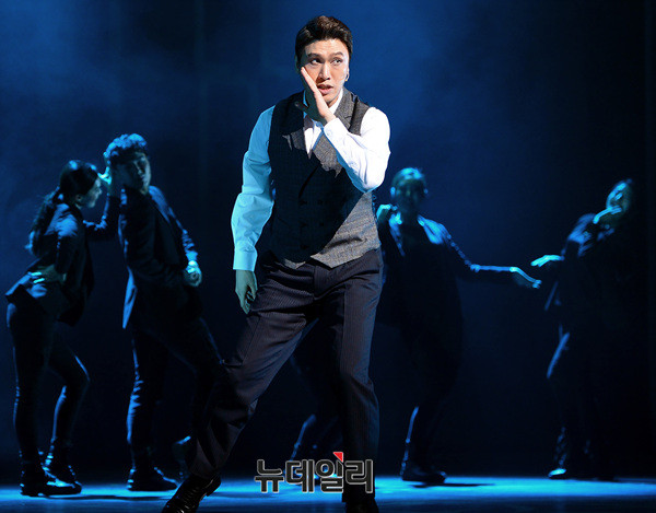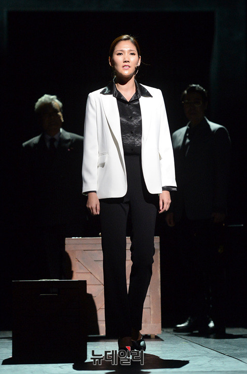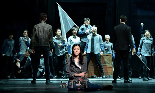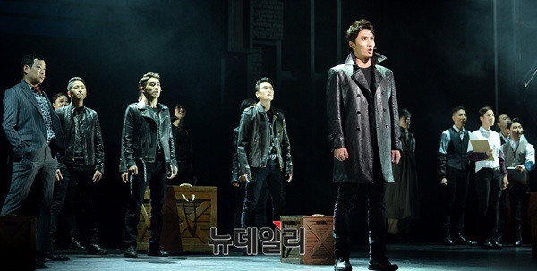 뮤지컬 '모래시계'의 배우들이 12일 오후 서울 중구 충무아트센터 대극장에서 열린 프레스콜에서 하이라이트 장면을 시연하고 있다.