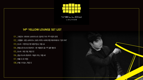 피아니스트 선우예권이 옐로우라운지 공연을 앞두고 세트리스트를 공개했다.선우예권은 오는 21일 오후 7시 논현동 클럽 옥타곤에서 제14회 옐로우라운지를 통해 관객들과 만난다.'결혼행진곡', '라벨: 라발스, 작품 72' 등 총 8곡으로 구성된 세트리스트는 선우예권이 관객들과 소통하고자하는 마음을 담아 직접 선곡해 구성했다. 크리스마스 분위기를 느끼게 해줄 캐롤도 세트리스트에 포함됐다.캐롤의 곡명을 미정으로 공개하며 선우예권이 어떤 곡을 선곡할지, 그가 연주하는 캐롤은 어떤 느낌일지 많은 이들의 궁금증을 자아내고 있다.유니버설뮤직 관계자는 "선우예권이 선곡에 심혈을 기울인 것으로 알고 있다"라며 "대한민국에서 가장 핫한 클럽에서 대중들을 만나는 만큼 모두에게 친숙하고 편안하게 다가설 수 있는 곡들을 연주할 예정이다"고 밝혔다.유니버설뮤직이 주관하는 옐로우라운지는 2004년 12월 독일의 베를린에서 시작된 '클럽에서 즐기는 클래식 콘서트'라는 콘셉트의 공연이다. 이번 공연에서는 유니버설뮤직 코리아의 국내 레이블인 온더레코드 소속 가수 YEIN(예인)이 오프닝을 맡는다.[사진=유니버설뮤직]