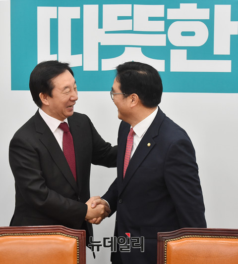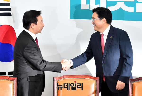 김성태 자유한국당 신임 원내대표가 13일 오전 국회 더불어민주당 원내대표실을 찾아 우원식 원내대표를 예방하고 악수를 나누고 있다.