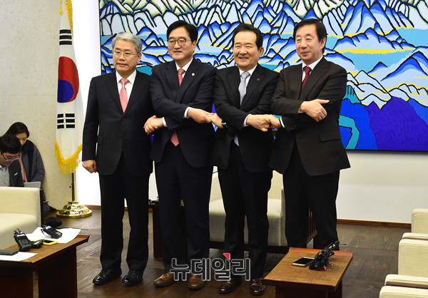 정세균 국회의장, 김성태 자유한국당 신임 원내대표, 우원식 더불어민주당, 김동철 국민의당 원내대표가 13일 오후 국회에서 열린 상견례를 겸 원내대표회동에서 손을 잡고 사진촬영을 하고 있다.