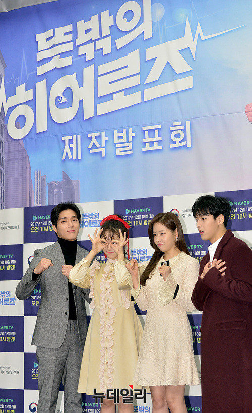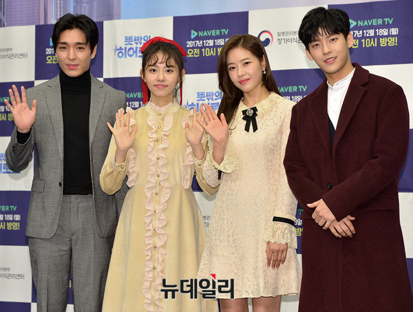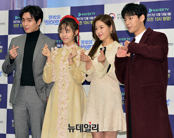 웹드라마 '뜻밖의히어로즈'의 배우들(최종훈, 이민혁, 김소혜, 박하나)이 13일 오후 서울 마포구 스탠포드호텔에서 열린 제작발표회에 참석해 포즈를 취하고 있다.