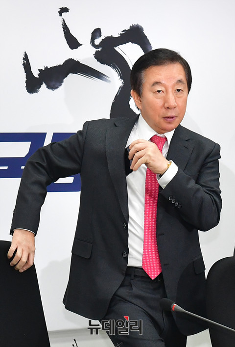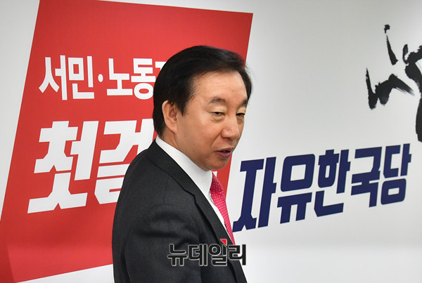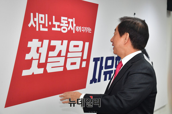 김성태 자유한국당 신임 원내대표가 14일 오전 국회에서 열린 원내대책회의에 참석해 '서민-노동자에게 다가가는 첫걸음!'이라는 백보드를 바라보고 있다.