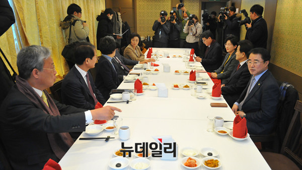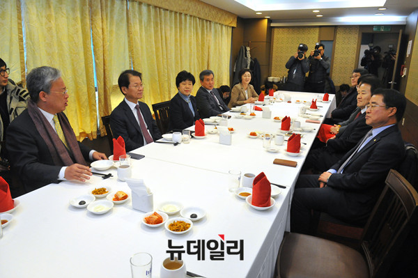 국민의당 평화개혁연대 의원들과 구당초 (당을 구하는 초선의원 모임) 의원들이 14일 오후 서울 여의도 한 중식당에서 열린 연석회의에 참석해 대화를 나누고 있다.