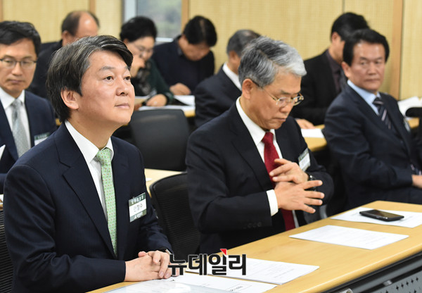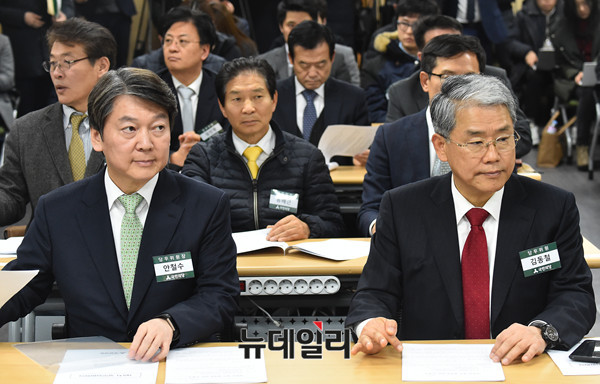 안철수 국민의당 대표가 15일 오후 서울 여의도 중앙당사에서 열린 제8차 당무위원회에 참석해 김동철 원내대표와 인사를 하고 있다.