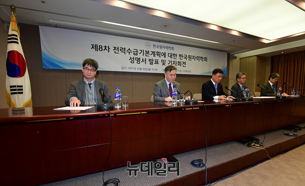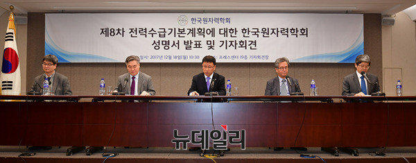 심형진 원자력학회 이사, 정범진 부회장, 김학노 학회장, 송종순 소통위원장, 정동욱 이사(왼쪽부터)가 18일 오전 한국프레스센터에서 기자회견을 열고, 전력수급기본계획에 대한 학회의 성명서를 발표하고 있다.