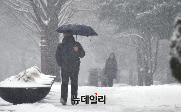 서울전역에 올해 첫 대설주의보가 내려진 가운데 18일 오전 국회에서 시민들이 발걸음을 재촉하고 있다. 기상청은 이날 서울 경기 중부지방 및 경북 북부에 오후까지 눈이 내린 후 차츰 그칠 것으로 예상했다.