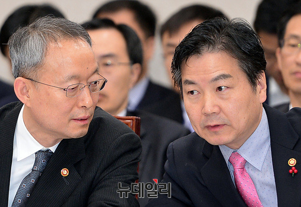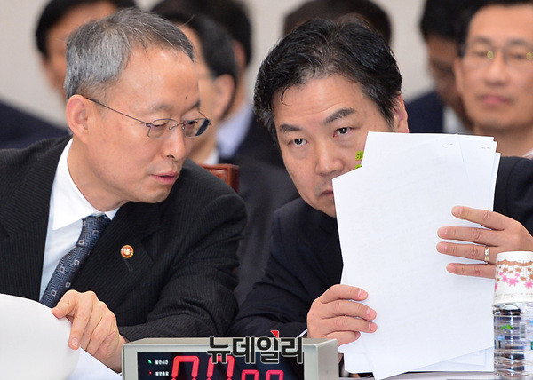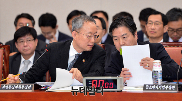 박운규 산업통상자원부 장관과 홍종학 중소벤처기업부 장관이 18일 오전 국회에서 열린 산업통상자원중소벤처기업위원회 '한미FTA개정협상 추진계획 보고'에 참석해 대화를 나누고 있다.