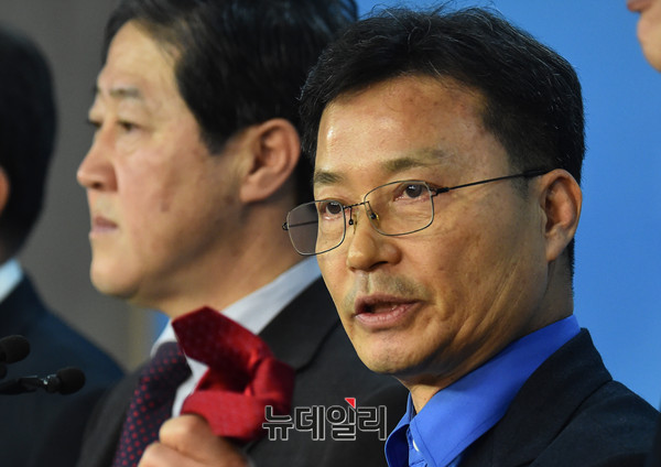 김척수 자유한국당 부산 사하구갑 당협위원장이 18일 오후 국회 정론관에서 당무감사 결과 당협위원장 교체대상이 된 것과 관련해 기자회견을 하고 있다.