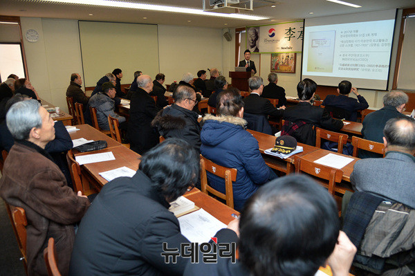 김정민 연세대 이승만연구원이 19일 오후 서울 중구 정동 프란치스코 교육회관에서 열린 제82차 이승만포럼에 발표자로 나서 '워싱턴회의 시기 이승만의 공공외교'를 주제로 발표하고 있다.