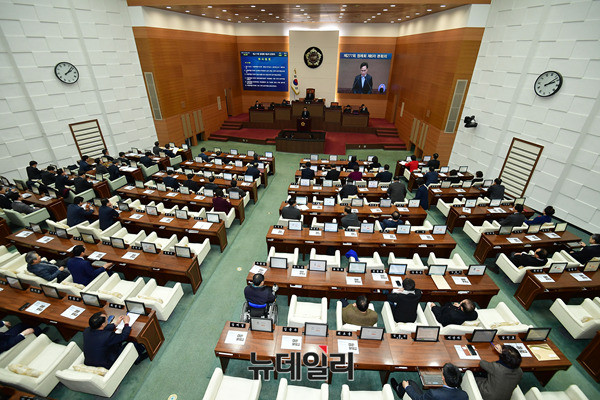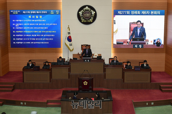 양준욱 서울시의회 의장이 20일 오후 서울시의회에서 열린 본회의에서 회의를 주재해 안건을 처리하고 있다.