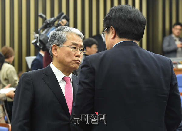 김동철 국민의당 원내대표가 20일 오후 국회에서 열린 의원총회에서 안철수 당대표 비서실장인 송기석 의원과 대화를 나누고 있다.