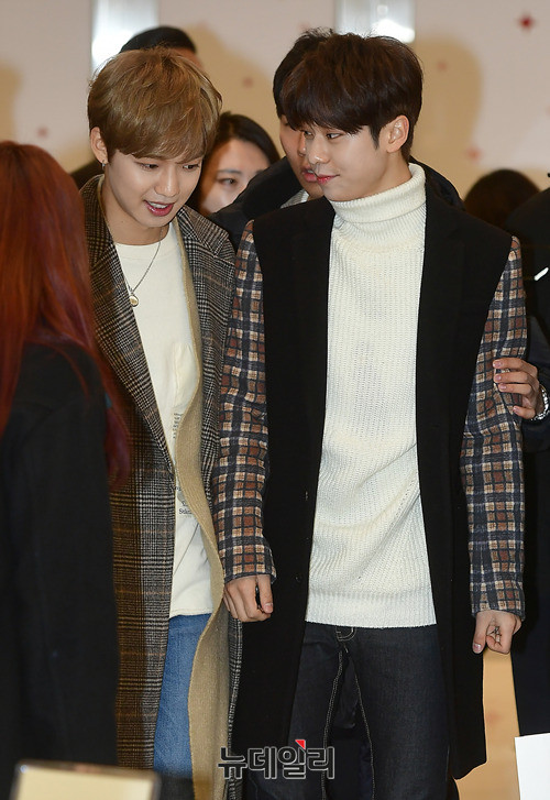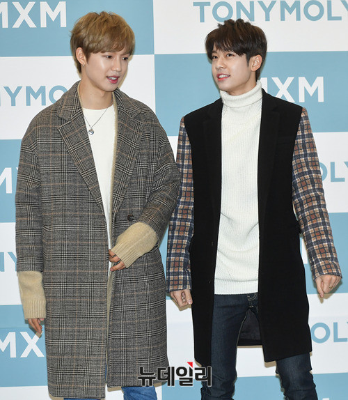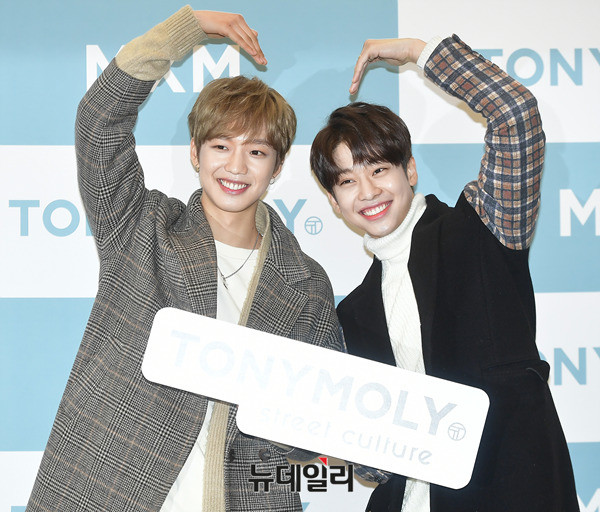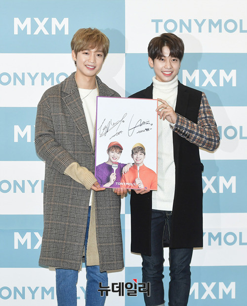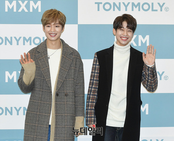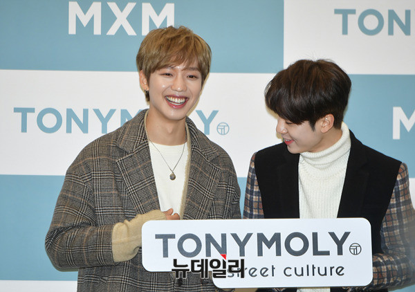 MXM 멤버 임영민, 김동현(왼쪽부터)이 20일 오후 서울 강남구 스타필드 코엑스몰에서 진행된 MXM 팬사인회에 참석해 포토타임을 갖고 있다. 이날 MXM 임영민X김동현 팬사인회는 피키비키 라인 론칭을 기념하기 위해 진행됐다.