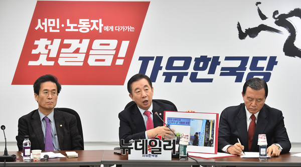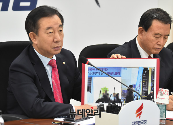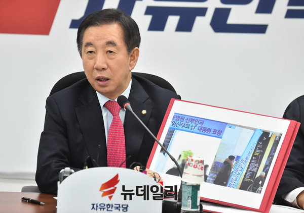 김성태 자유한국당 원내대표가 21일 오전 국회에서 열린 원내대책회의에서 "문재인 대통령이 이대목동병원에 '임산부의 날' 표창을 수여했는데 그 병원이 4명의 신생아를 죽였다" "문재인 정권의 '광 팔기 인기 영합주의' 정치로 보건의료정책이 망가져 신생아 4명이 아까운 생명을 잃었는데 현 정권은 무슨 일을 했는지 되묻지 않을 수 없다"고 정부를 비판했다.