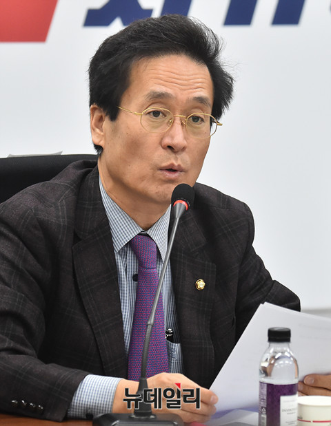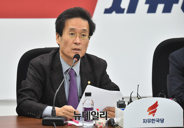 함진규 자유한국당 정책위의장이 21일 오전 국회에서 열린 원내대책회의에서 모두발언하고 있다.