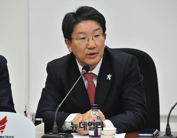 권성동 자유한국당 원내대표가 21일 오전 국회에서 열린 원내대책회의에서 모두발언하고 있다.
