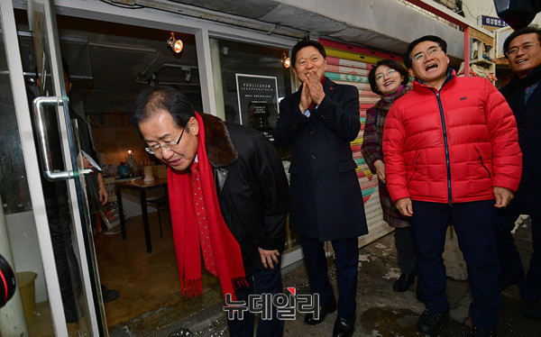 홍준표 자유한국당 대표가 21일 오후 서울 중구 산림동 철공소거리 을지예술공간을 방문해 자신을 연호하는 상인들에게 인사하고 있다. 홍 대표는 이날 골목 소통 제1탄으로 을지로 철공소 거리를 방문해 상인들과 청년예술가들을 만났다.