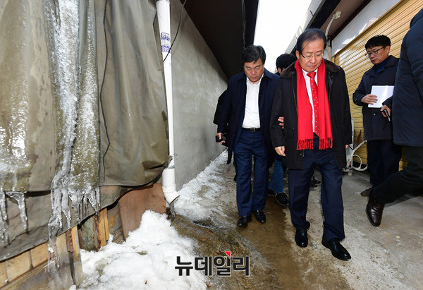 홍준표 자유한국당 대표가 21일 오후 서울 중구 산림동 철공소 거리를 방문하고 있다. 홍 대표는 이날 골목 소통 제1탄으로 을지로 철공소 거리를 방문해 상인들과 청년예술가들을 만났다.