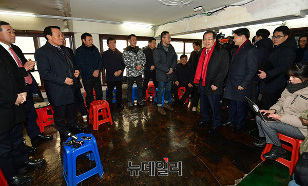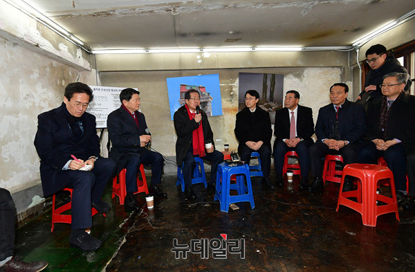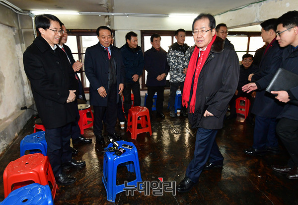 홍준표 자유한국당 대표가 21일 오후 서울 중구 을지예술공간 을지1호를 방문해 상인과 청년예술가들과 간담회를 가지고 있다. 홍 대표는 이날 골목 소통 제1탄으로 을지로 철공소 거리를 방문해 상인들과 청년예술가들을 만났다.