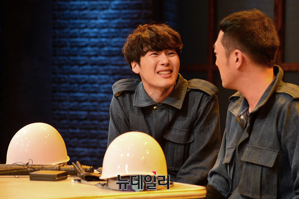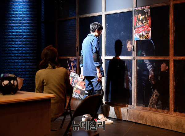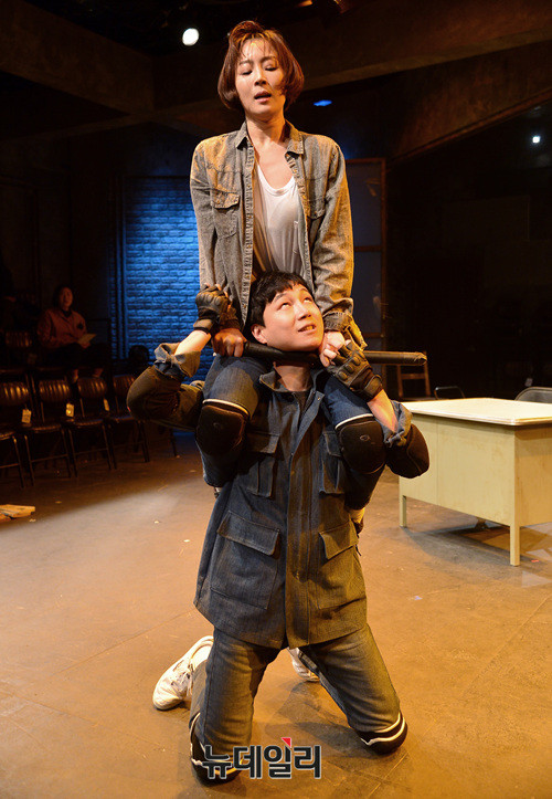 연극 '더헬멧(The Helmet)'의 배우들이 21일 오후 서울 종로구 대학로 아트원씨어터에서 열린 프레스콜에서 전막 시연을 하고 있다.