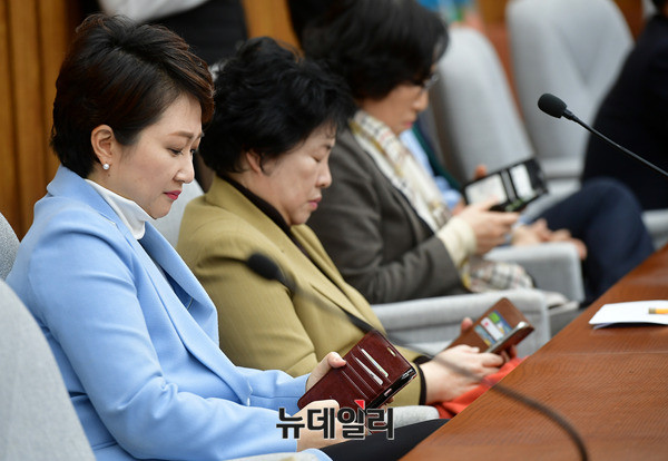 이언주 국민의당 의원이 22일 오전 국회에서 열린 의원총회에 참석해 자리하고 있다. 국민의당은 바른정당과 통합을 놓고 내홍을 겪고 있다.