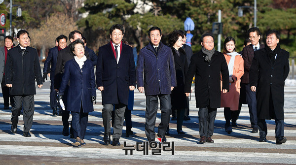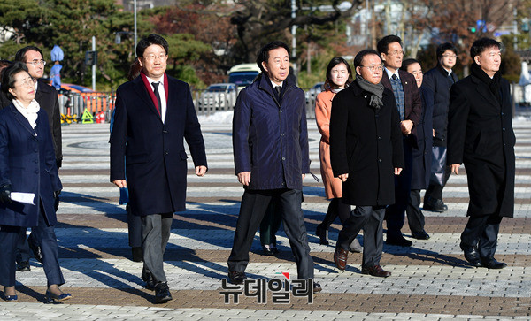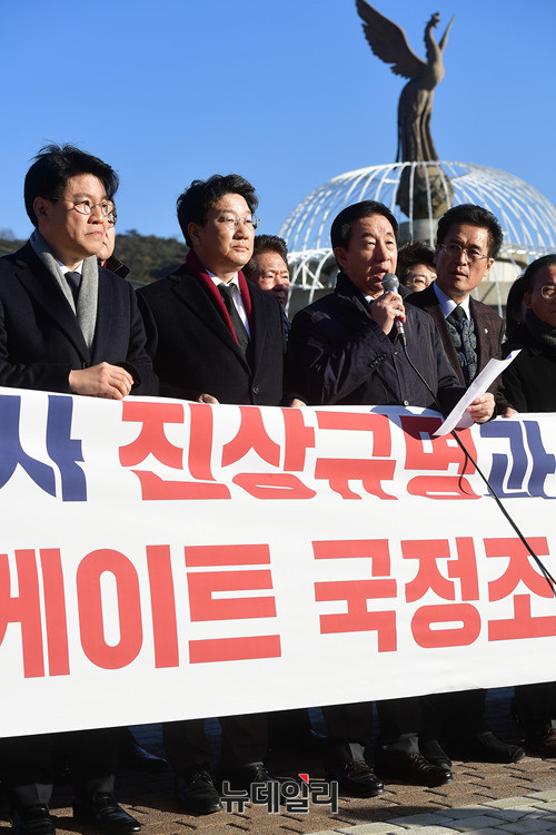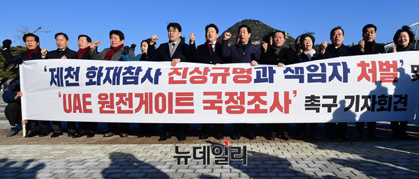 김성태 자유한국당 원내대표, 권성동 국회 법사위원장을 비롯한 의원들이 26일 오전 서울 청와대 분수대 광장에서 열린 '제천 화재참사 진상규명과 책임자 처벌 및 UAE 원전게이트 국정조사'를 촉구하는 기자회견에서 참석하고 있다. 이들은 성명을 통해 "문재인 정권의 고압적인 일방통행식 국정운영을 단호히 규탄한다"고 밝혔다.