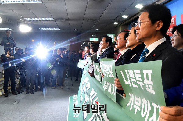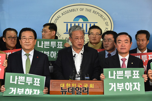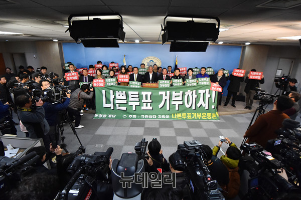 국민의당 '나쁜투표 거부운동본부' 소속 통합반대파 의원들이 전당원 투표를 하루 앞둔 26일 오후 국회 정론관에서 기자회견을 열고 투표 거부 동참을 촉구하고 있다.