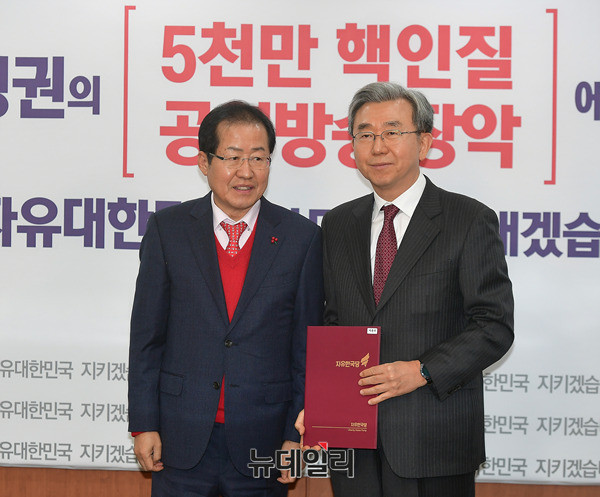 홍준표 자유한국당 대표가 26일 서울 여의도 당사에서 열린 조직강화특별위원회 임명장 수여식에서 이용구 위원장과 기념촬영을 하고 있다.