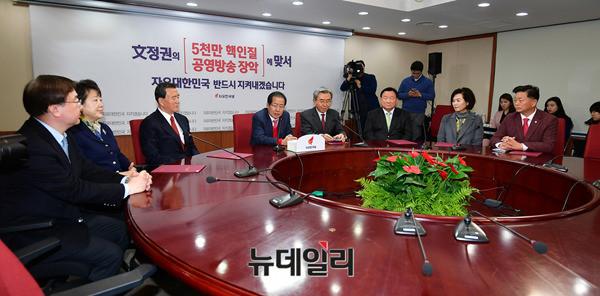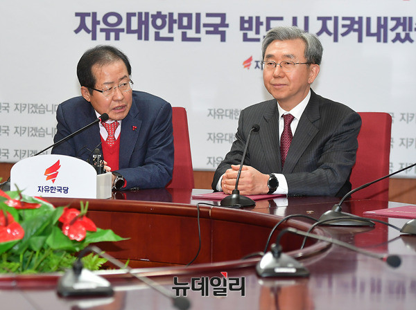 이용구 조직강화특별위원장이 26일 서울 여의도 자유한국당사에서 열린 임명장 수여식 직후 발언을 하고 있다. 이날 진행된 조직강화특별위원회 임명장 수여식에는 이용구 위원장을 비롯해 홍문표 사무총장, 류석춘 혁신위원장, 정주택 윤리위원장, 황선혜 전 숙명여대 총장, 이인실 전 변리사협회 이사, 김성원 의원이 각각 임명됐다.