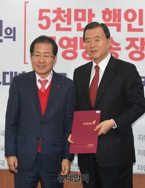 홍준표 자유한국당 대표가 26일 서울 여의도 자유한국당사에서 열린 조직강화특별위원회 임명장 수여식에서 홍문표 위원과 기념촬영을 하고 있다. 이날 진행된 조직강화특별위원회 임명장 수여식에는 이용구 위원장을 비롯해 홍문표 사무총장, 류석춘 혁신위원장, 정주택 윤리위원장, 황선혜 전 숙명여대 총장, 이인실 전 변리사협회 이사, 김성원 의원이 각각 임명됐다.