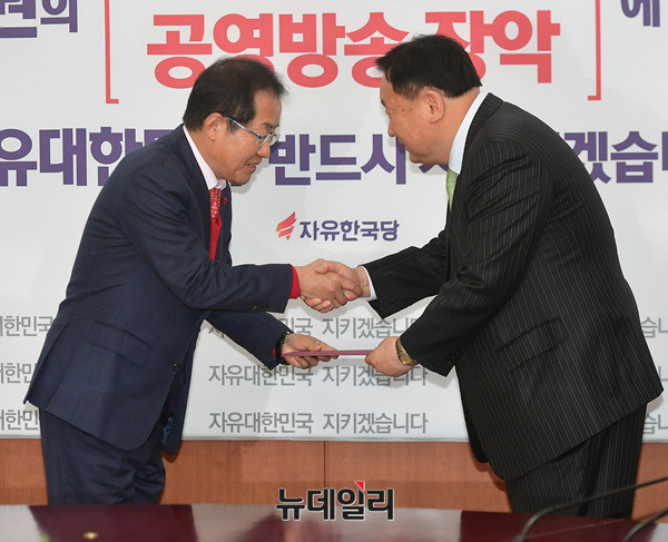 홍준표 자유한국당 대표가 26일 서울 여의도 자유한국당사에서 열린 조직강화특별위원회 임명장 수여식에서 정주택 위원에게 임명장을 수여하고 있다. 이날 진행된 조직강화특별위원회 임명장 수여식에는 이용구 위원장을 비롯해 홍문표 사무총장, 류석춘 혁신위원장, 정주택 윤리위원장, 황선혜 전 숙명여대 총장, 이인실 전 변리사협회 이사, 김성원 의원이 각각 임명됐다.