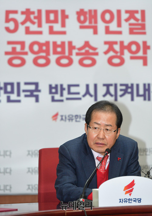 홍준표 자유한국당 대표가 26일 서울 여의도 자유한국당사에서 열린 조직강화특별위원회 임명장 수여식에서 당의 내년 새 슬로건을 밝히고 있다.