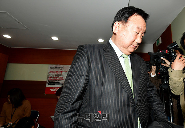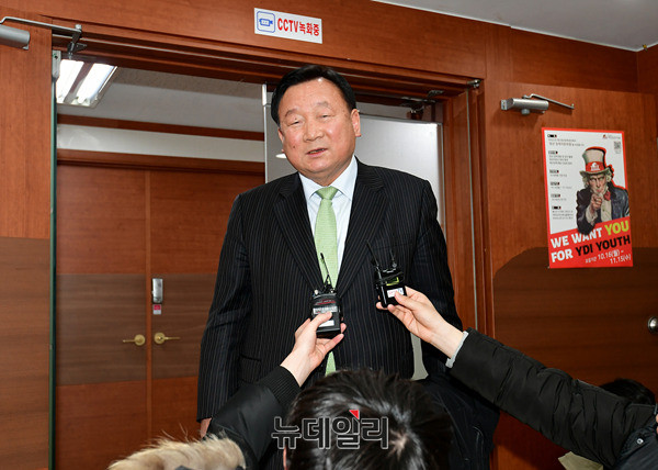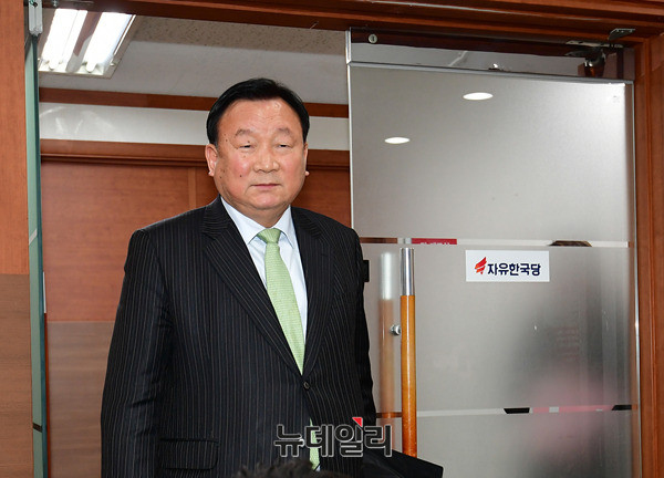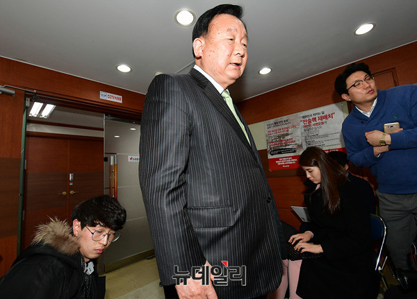 정주택 자유한국당 윤리위원장이 26일 오후 서울 여의도 당사에서 열린 류여해 최고위원과 정준길 전 대변인의 징계안에 관한 회의 직후 취재진의 질문에 답하고 있다. 정 위원장은 "류 최고위원과 정 전 대변인을 제명과 경고로 각각 징계안을 의결했다"고 밝혔다.