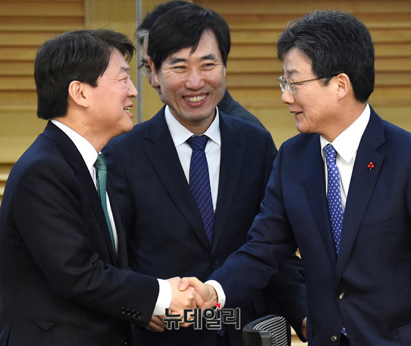 안철수 국민의당 대표와 유승민 바른정당 대표가 27일 오후 국회 의원회관 열린 '바른정당 원외위원장, 안철수 국민의당 대표 초청 간담회'에 참석해 인사를 하고 있다.