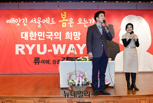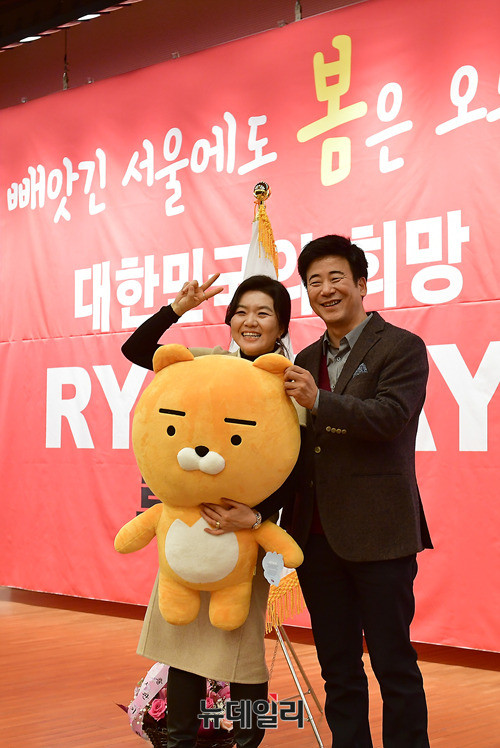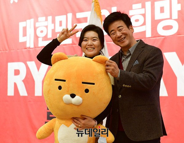 류여해 전 자유한국당 최고위원과 정준길 전 대변인이 27일 오후 국회도서관에서 열린 북콘서트에 앞서 캐릭터 인형과 기념촬영을 하고 있다. 자유한국당은 지난 26일 윤리위원회를 열고 류 전 최고위원과 정 전 대변인에 제명과 경고를 각각 의결했다.